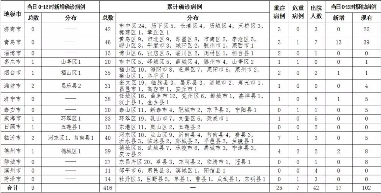 中新網(wǎng)2月8日電 據(jù)山東省衛(wèi)健委消息,2020年2月8日0-12時(shí),山東省報(bào)告新型冠狀病毒感染的肺炎新增確診病例9例,累計(jì)確診病例416例(含重癥病例25例,危重癥病例7例,出院42例,無(wú)死亡病例);新增疑似病例17例,現(xiàn)有疑似病例102例。截至目前,追蹤到密切接觸者12319人,已解除醫(yī)學(xué)觀察7139人,診斷為疑似或確診205例,尚有4975人正在接受醫(yī)學(xué)觀察。