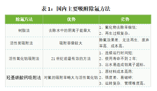 現(xiàn)在市面上較常見(jiàn)的除氟方法是吸附法,如用活性氧化鋁吸附,此方法經(jīng)濟(jì)實(shí)惠,但弊端也較多,再生流程復(fù)雜,并且再生后吸附能力大大下降。其他除氟方法介紹(如表1):