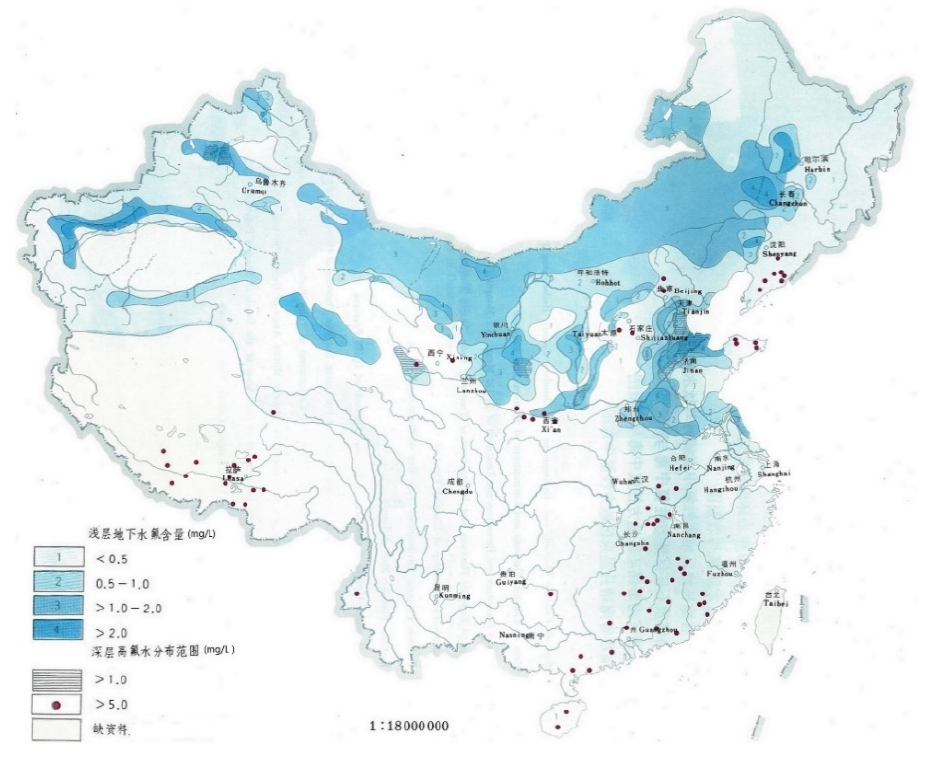 就世界范圍來看,幾乎沒有一個國家不受氟害之苦。如下圖所示,我國含氟地下水分布極廣,對于淺層地下水來說,高氟水問題比較突出的地域是華北地區、內蒙古地區、西北五省的部分地區以及東三省某些地區,基本上都集中在北方地域,對于南方地表水資源較充足的省份,高氟飲用水問題并不突出。