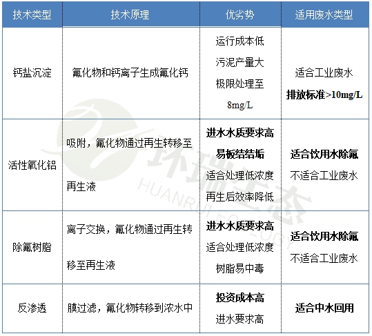 除了鈣鹽沉淀法之外,目前比較常見的去除技術還有氧化鋁吸附,樹脂離子交換和反滲透等。每一項技術都有其相應的優劣勢和適用的廢水類型,具體統計如下表所示: