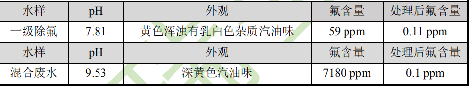 該廠的污水處理系統(tǒng)已經(jīng)用了很多年,給其提供了高效除氟劑GMS-F4之后進(jìn)行實(shí)驗(yàn),按貴公司當(dāng)前的使用工藝和藥劑處理,高效除氟劑GMS-F4變量添加,其實(shí)驗(yàn)結(jié)果如下: